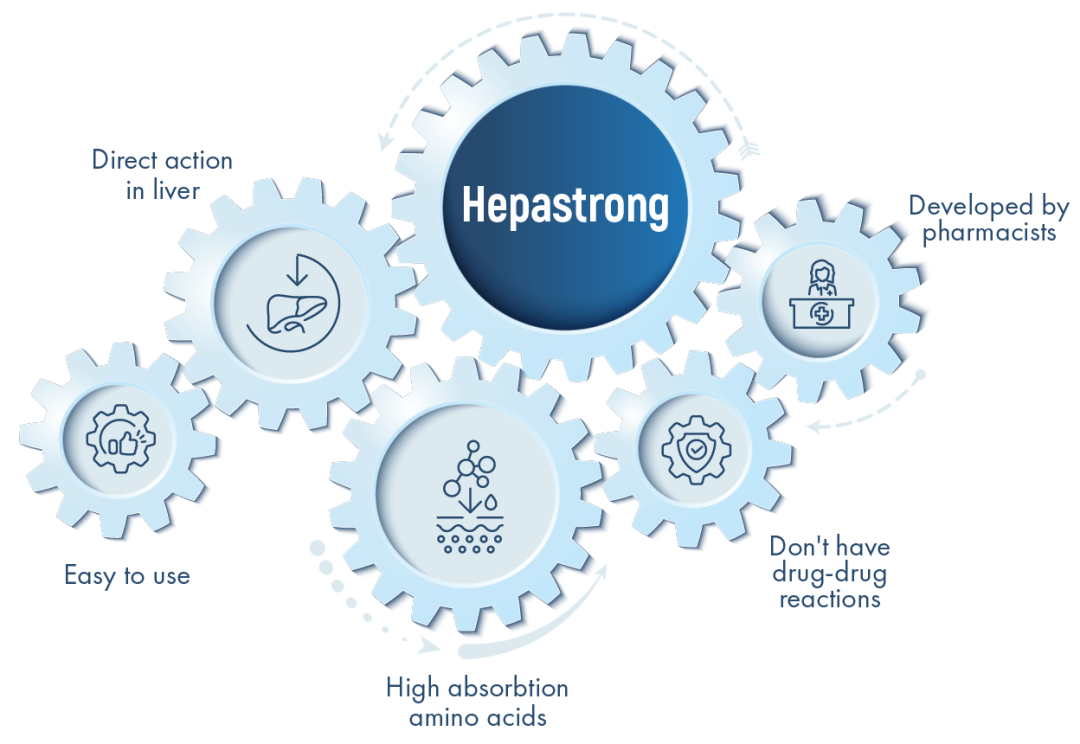 Hepastrong is an amino acid complex that supports healthy liver functions and protect liver from damage caused by toxins, alcohol, medication. Helps patients to avoid liver complications.